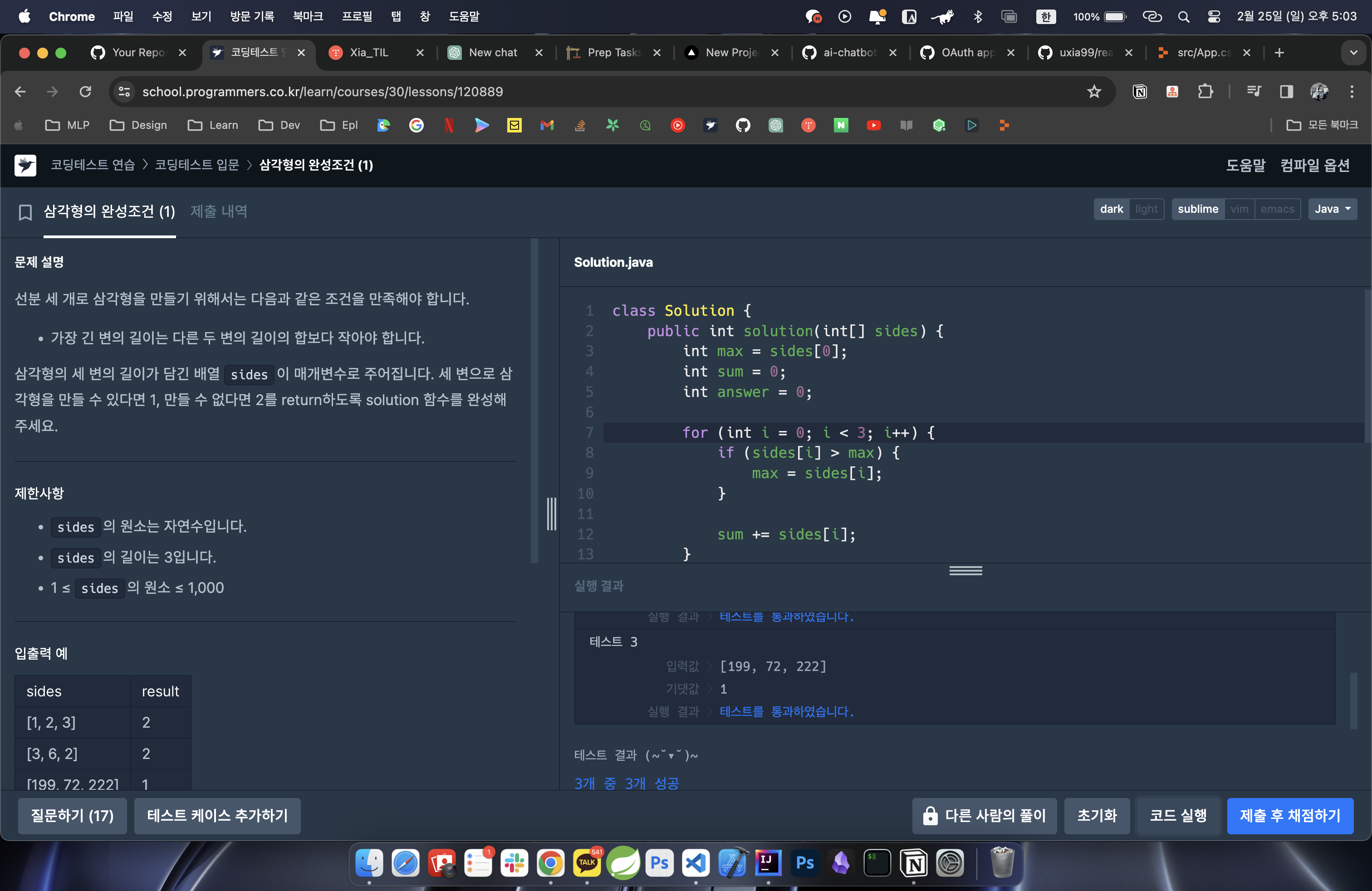 프로그래머스 Lv.0 '삼각형의 완성조건(1)' 자바