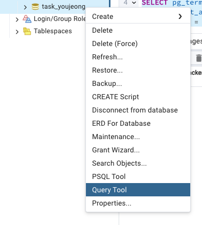 → Query Tool 에서 위 쿼리문을 입력해서 실행한다.