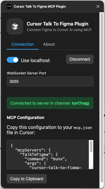 Cursor Talk To Figma MCP Plugin을 실행해서 Use localhost를 3055에 연결한다.
