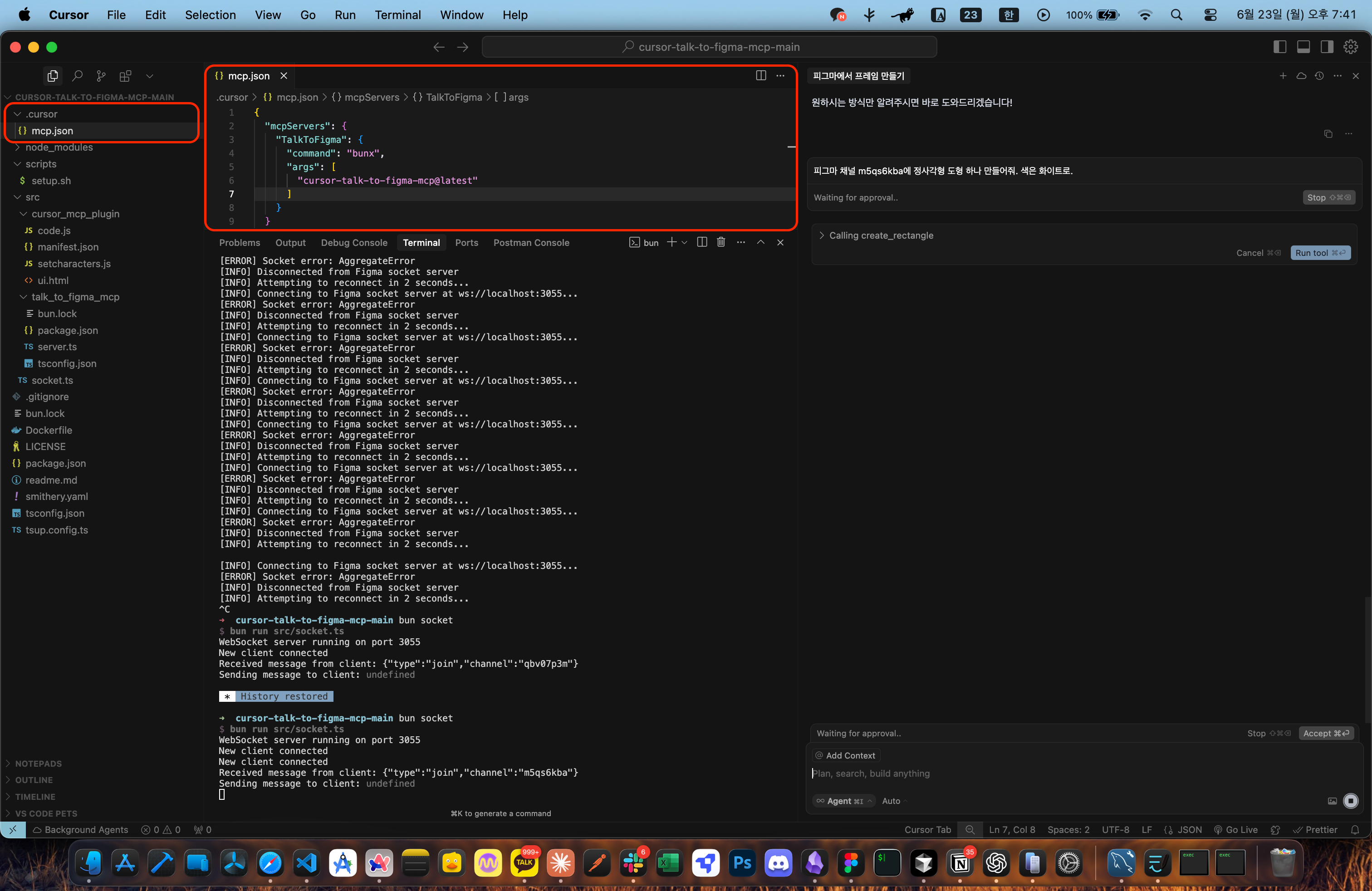 Figma 플러그인에 Copy to Clipboard를 해서 Cursor의 mcp.json 파일에 붙여넣고 저장한 뒤 실행해야 한다.