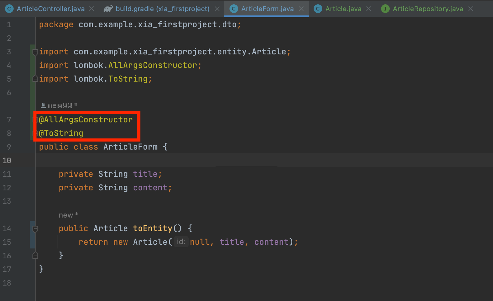 생성자와 toString 메소드 쓰기 귀찮은 경우