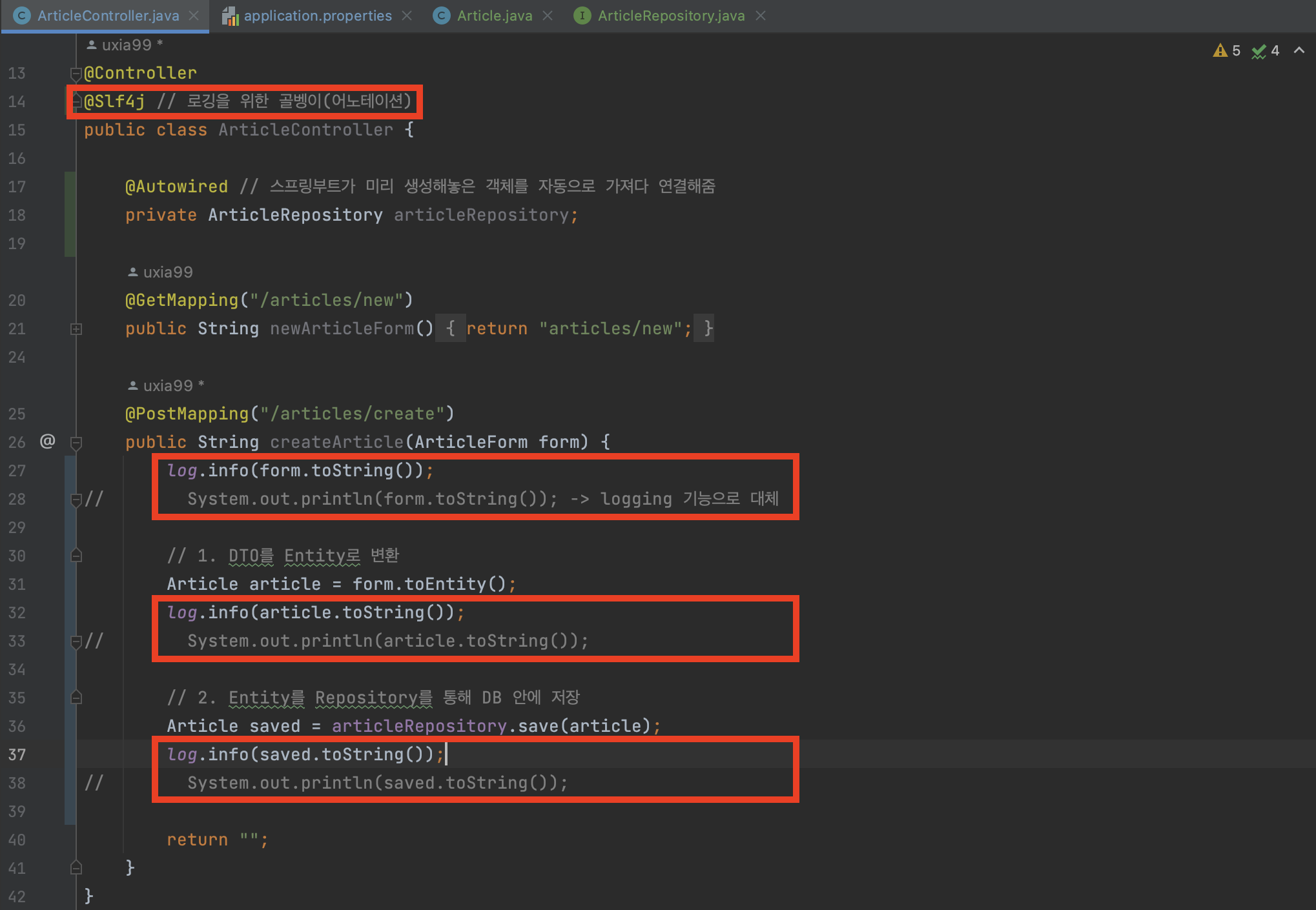 println으로 확인을 하는 게 기록에 남지도 않을 뿐더러,