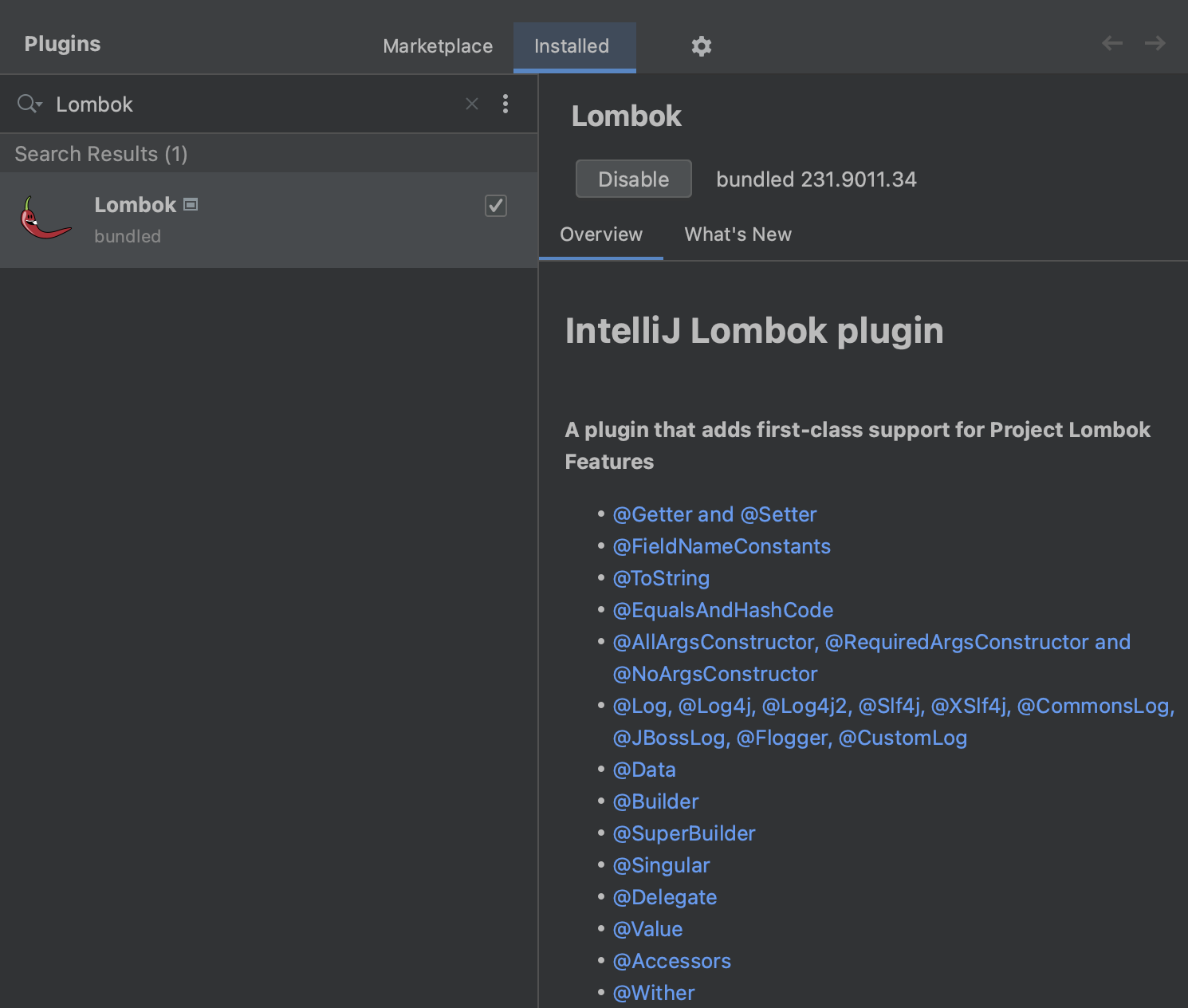 Marketplace에서 Lombok을 검색 후 설치해줘야하는데