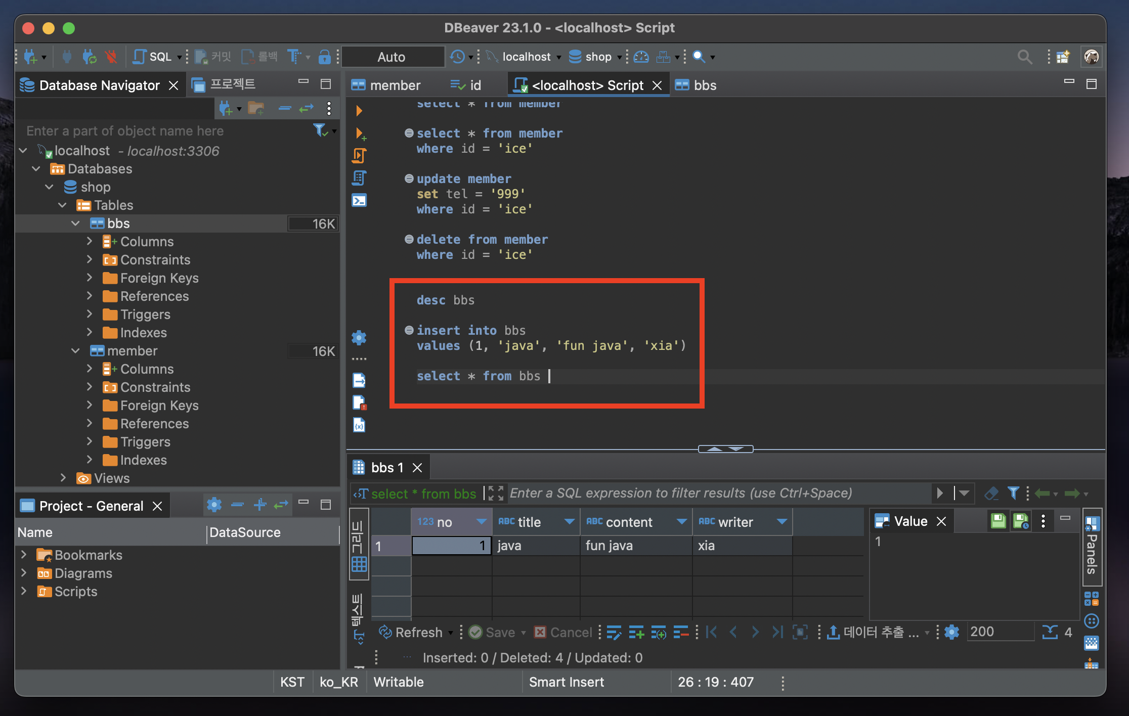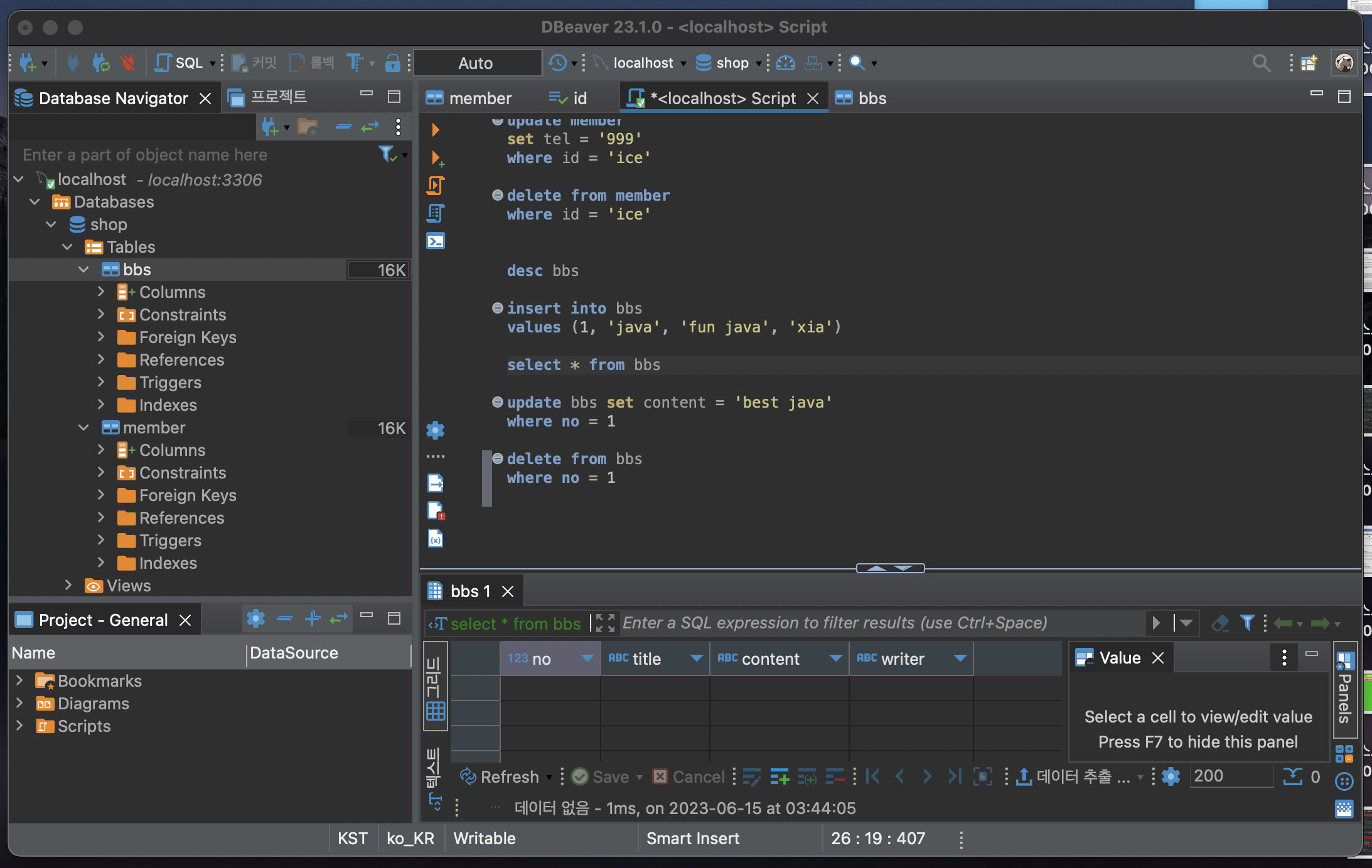 코드 작성 후 select * from bbs 부분에 커서를 두고