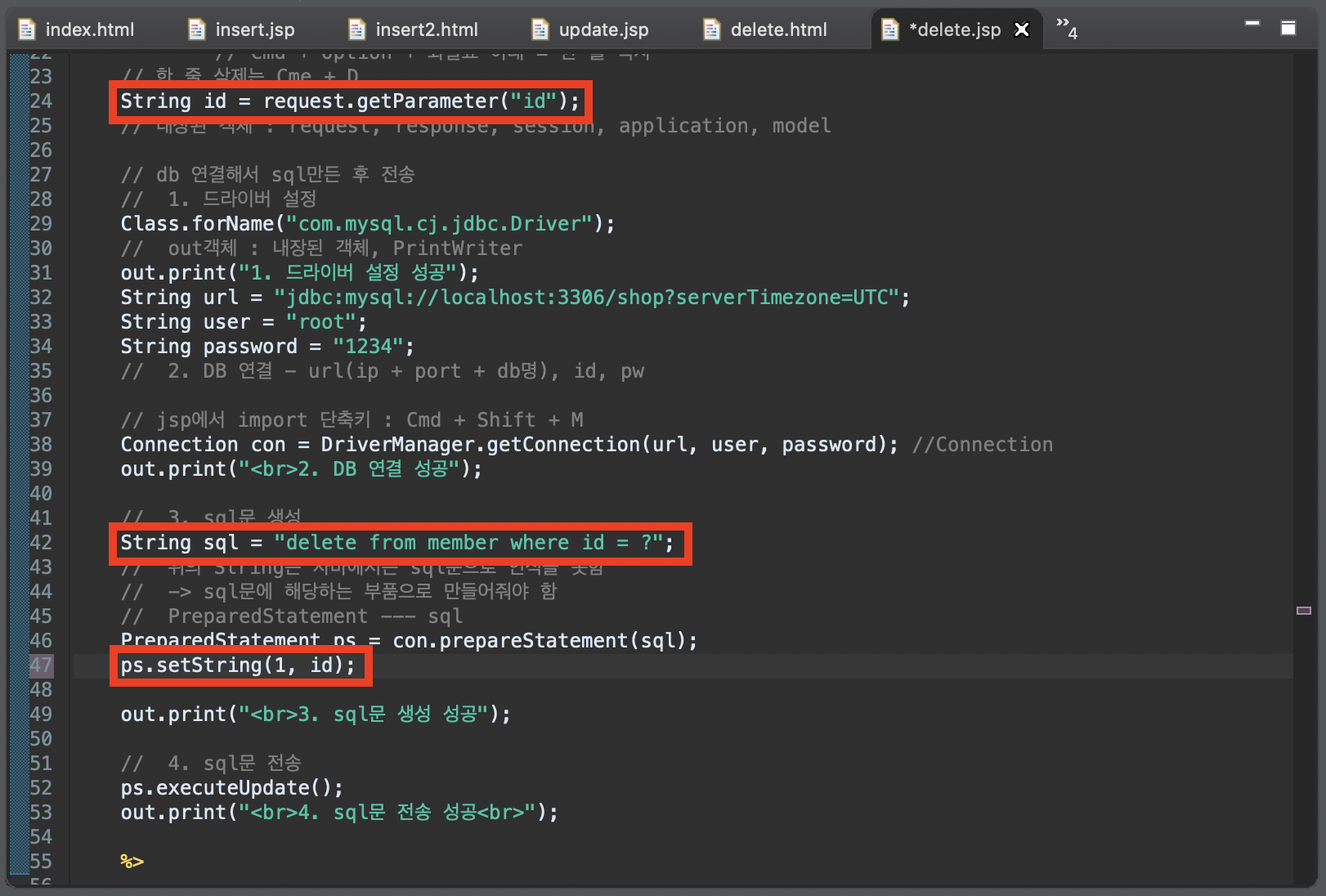 마지막으로 delete문을 작성하고