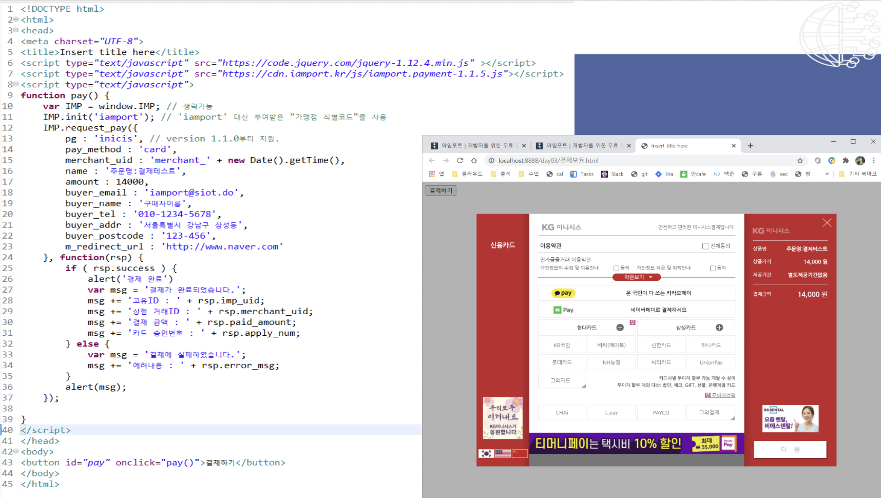 IMP.init('iamport'); // 'iamport' 대신 부여받은 "가맹점 식별코드"를 사용