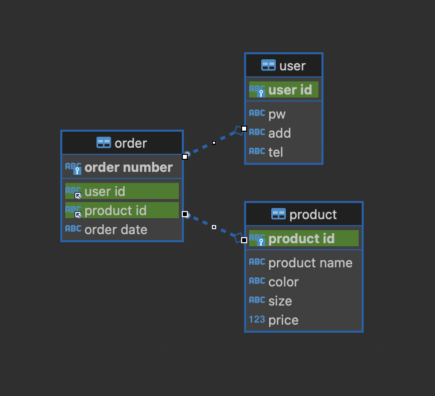 회원(User), 제품(Product), 주문(Order) 세 개의 테이블에