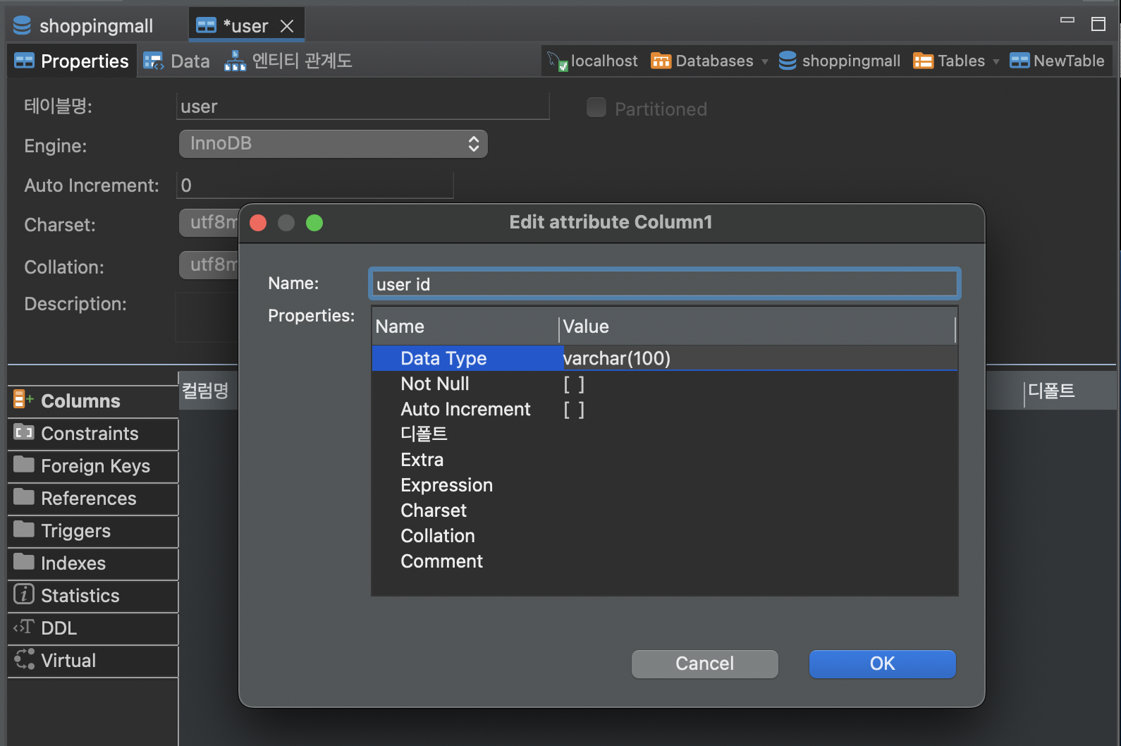 실제로 DBeaver에서 컬럼을 만들 때