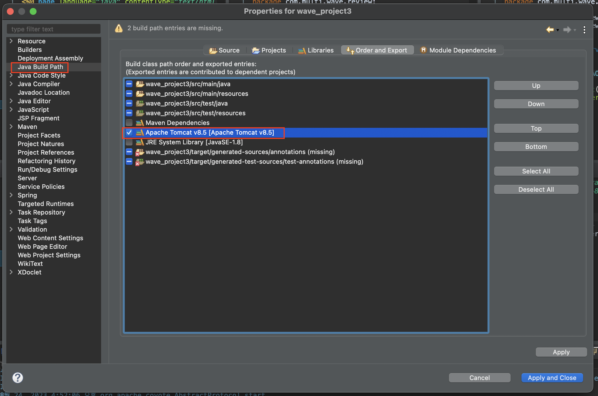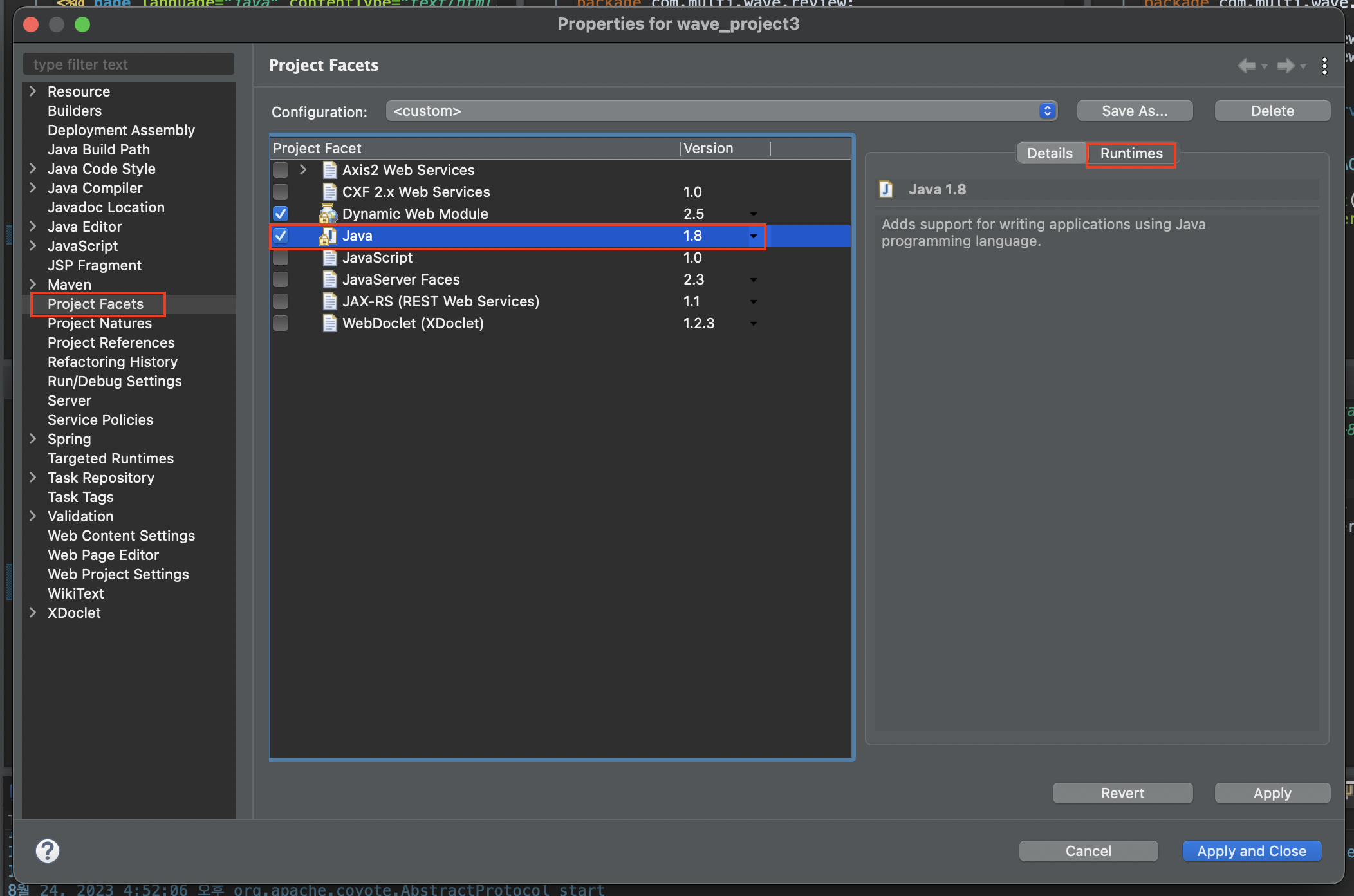 Project Facets → Java 버전을 설치된 버전으로 수정해준다.