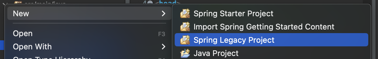 Cmd + N을 눌러 Spring Legacy Project를 생성해준다.