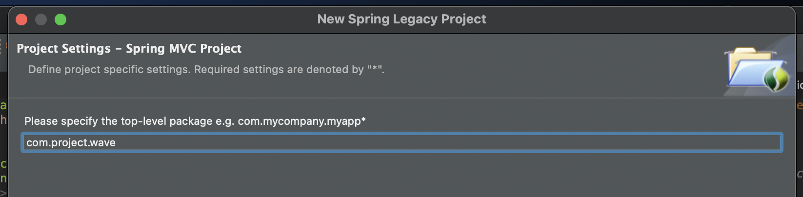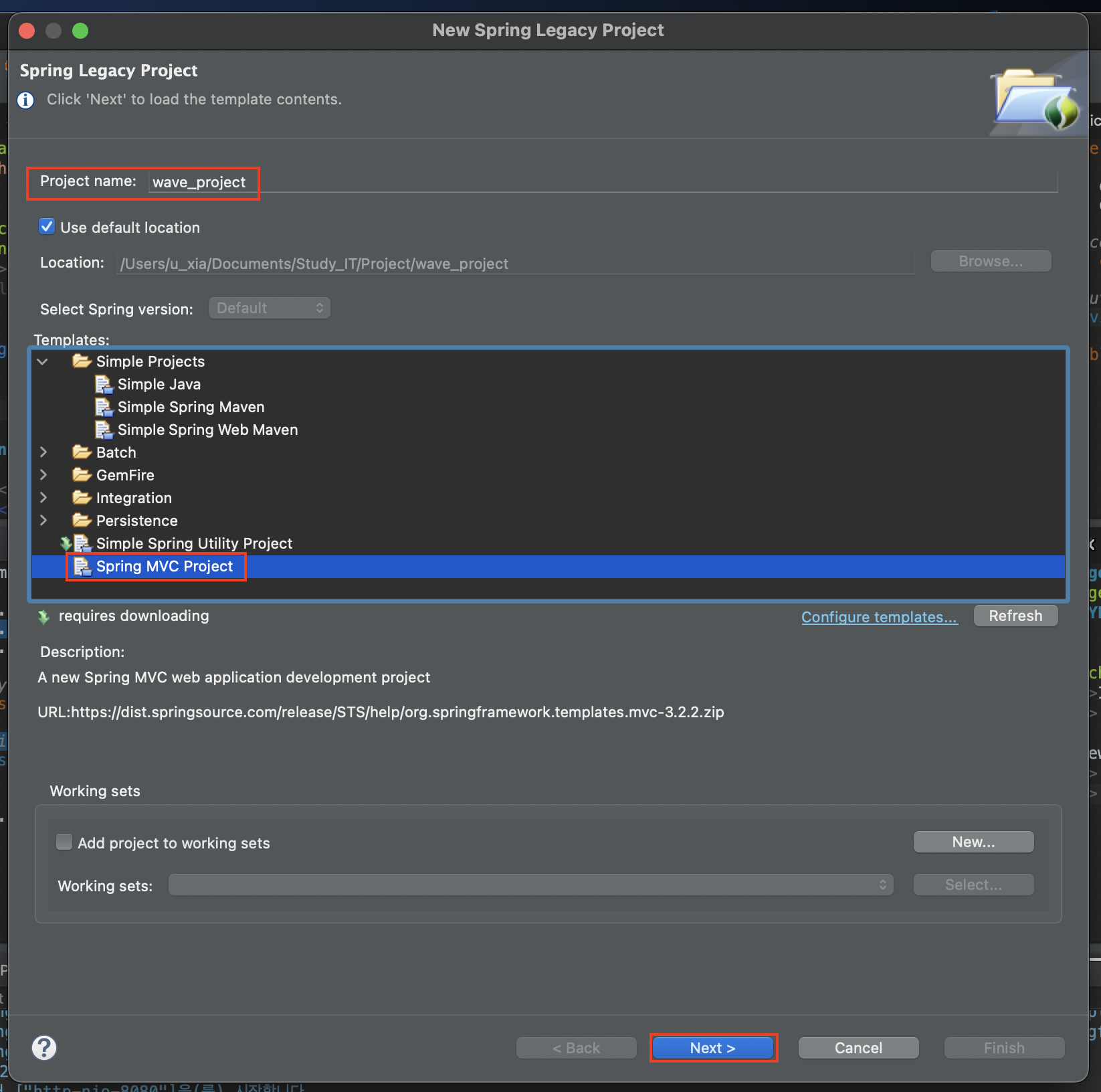 프로젝트명을 입력하고 Spring MVC Project로 설정한 후