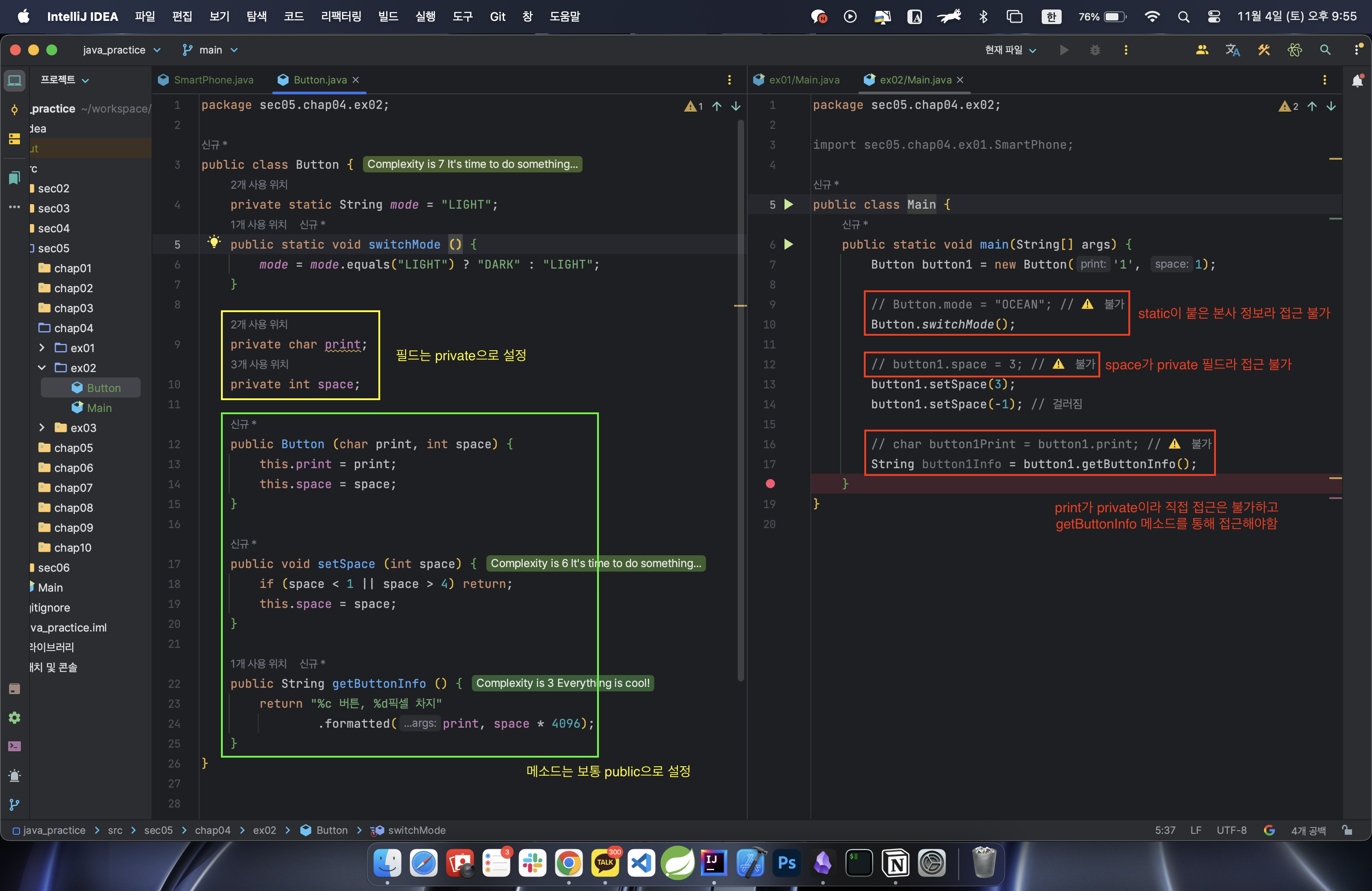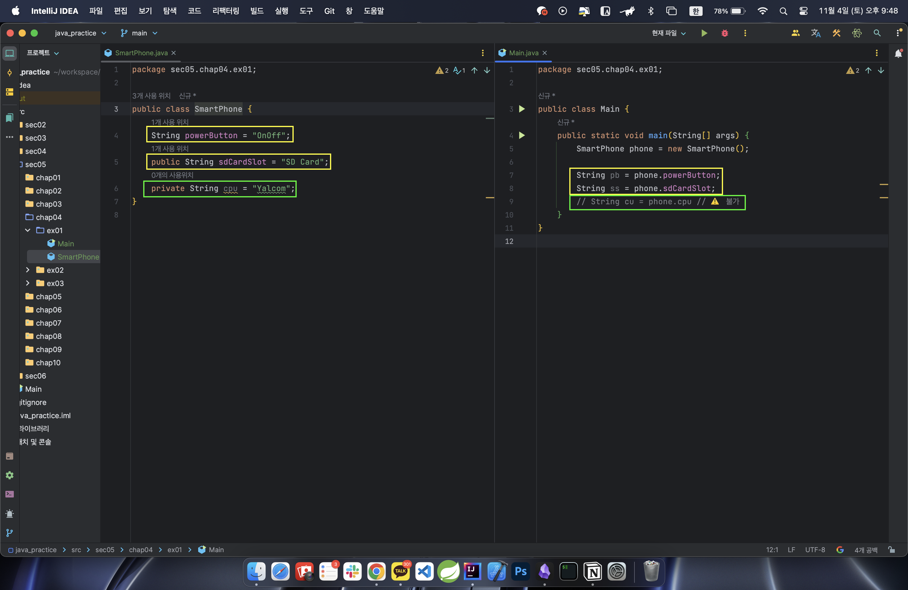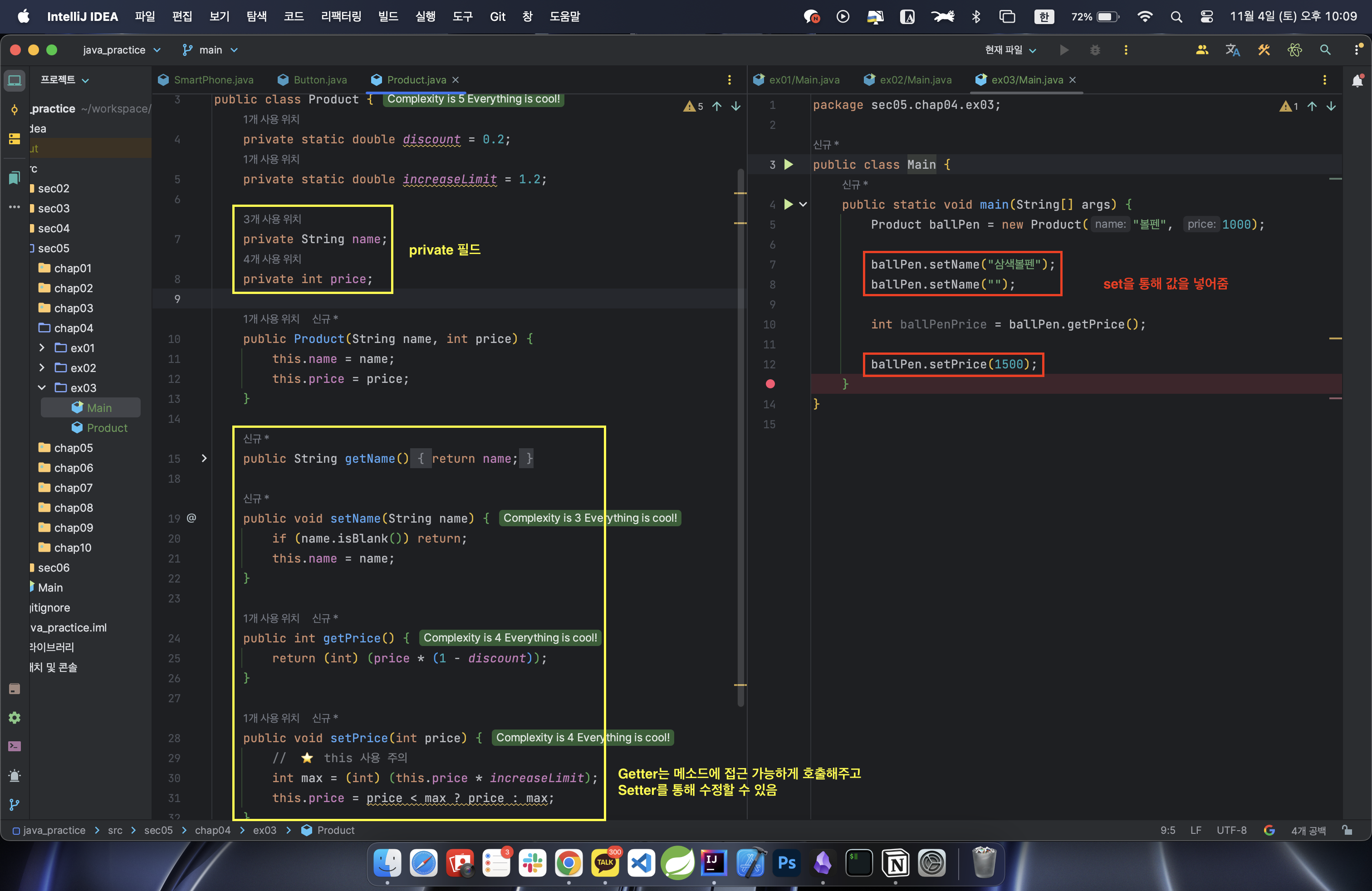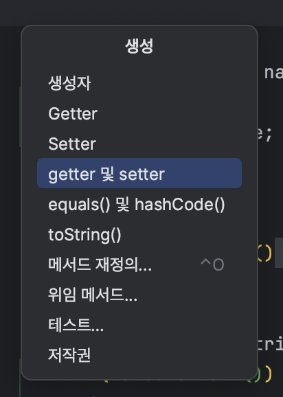 Cmd + N 으로 생성자와 Getter&Setter를 만들어준다.