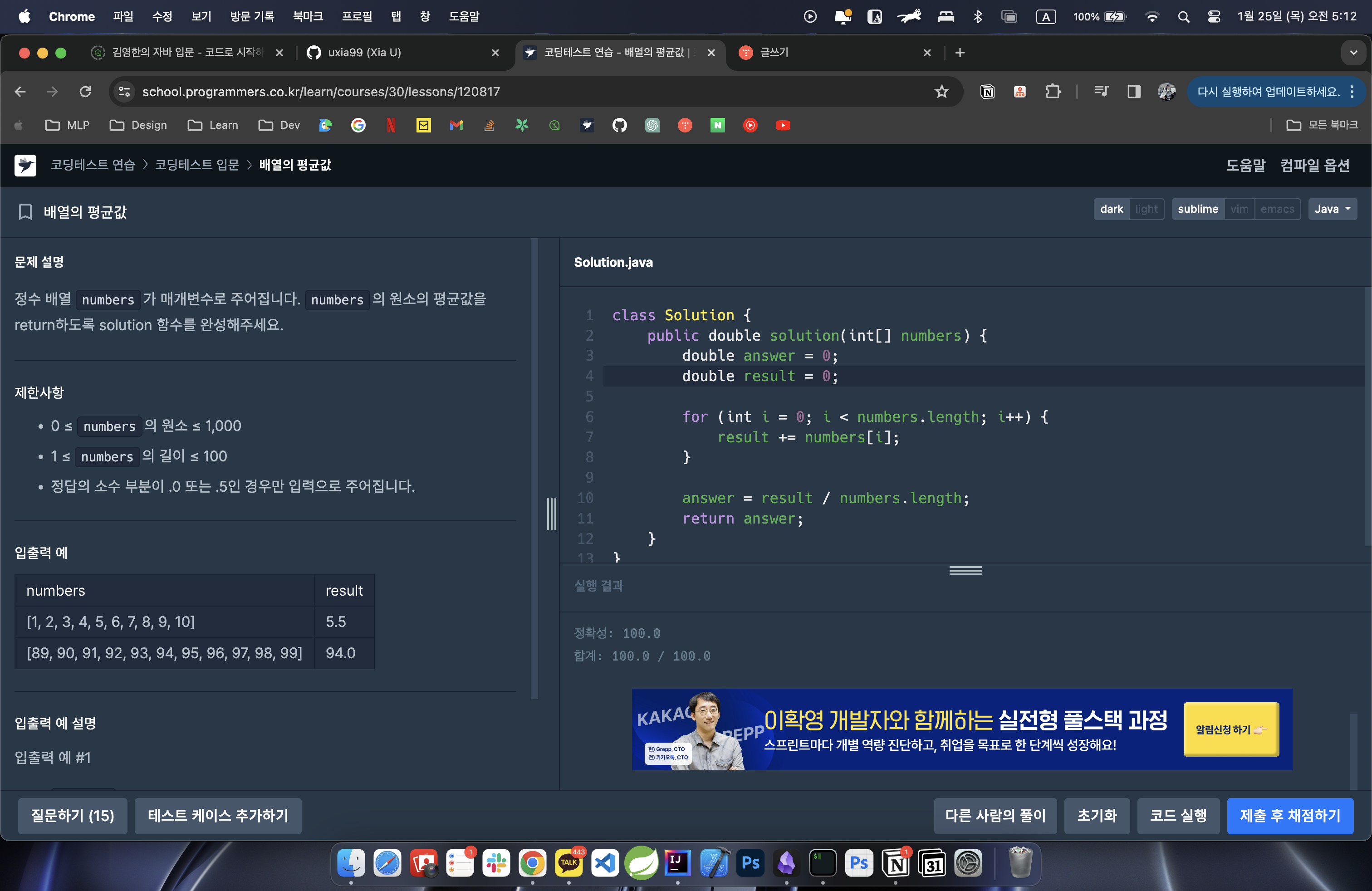 result 변수에 넣고, 이의 평균값을 answer에 넣어 출력하도록 한다.